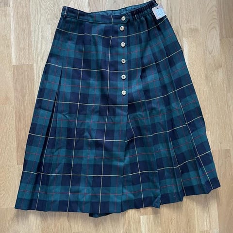 Snygg turkos kjol med veck fram och ett matchande bälte med ett guldfärgat spänne.