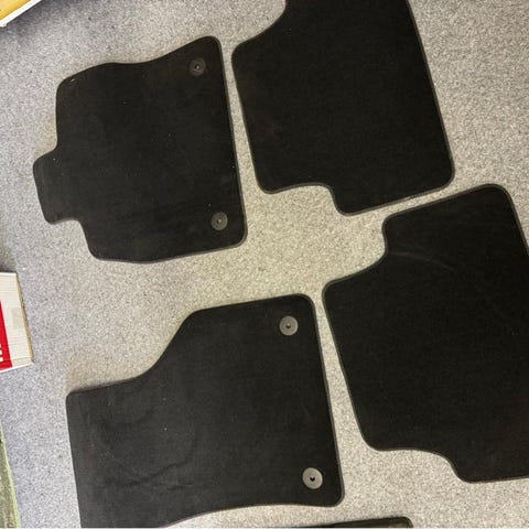 Volvo bilmattor i svart färg, anpassade för att skydda bilens golv. Setet innehåller fyra mattor med fästanordningar för stabil placering.