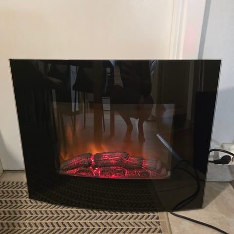 Elektrisk väggmonterad eldstad i svart färg. Designad för enkel installation på vägg och ger en realistisk eldseffekt. Passar för inomhusbruk och bidrar med visuell värme och atmosfär utan behov av skorsten eller bränsle.