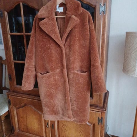 Skulle uppskatta att den passar till 38-40. Dock inte så långa ärmar så till mig som är 170 blir den aningen kort i ärmarna. Blågråaktig färg. Knäpps med två hakar.