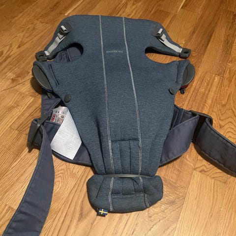 BabyBjörn bärsele i blått nätmaterial. Designad för att bära barn bekvämt och säkert. Justerbara remmar för anpassning och stöd. Passar för både fram- och bakbärning av barn.