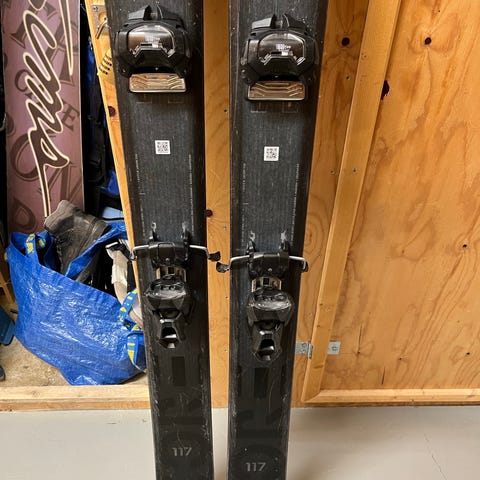 Atomic Backland 117 längd 191 cm och Shift bindning. Skidorna har en radie på 20 meter och väger 3170 gram. Körda 9 dagar. Stighudar Black Diamond.