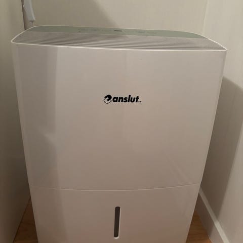 Woody Luftavfuktare i vit färg. En apparat för att minska luftfuktighet i inomhusmiljöer. Utrustad med kontrollpanel för inställningar och funktioner.