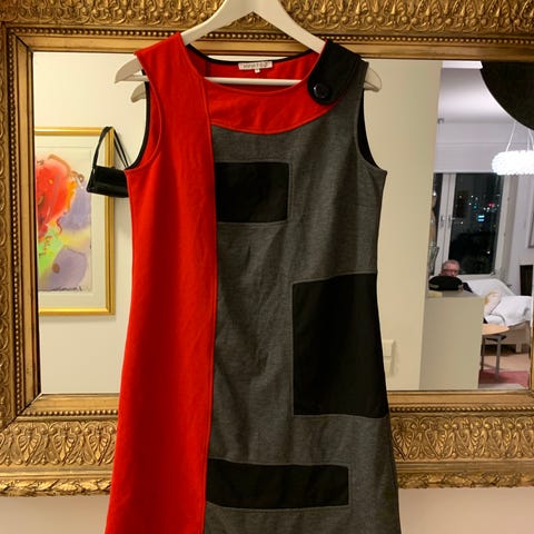 Otroligt fin och följsam klänning med lång ärm och v-ringning. Den har ett mönster med röda hjärtan på en marinblå bakgrund och ett matchande band i midjan. Knäppning vid ärmslut.