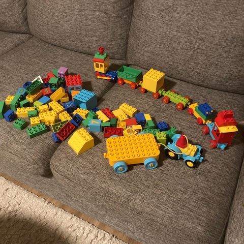 LEGO DUPLO City med grävmaskin, vagnar och några gubbar. Ca 1,5 kg. Husdjursfritt hem. Medföljande låda. Hämtas i centrala Västerås.