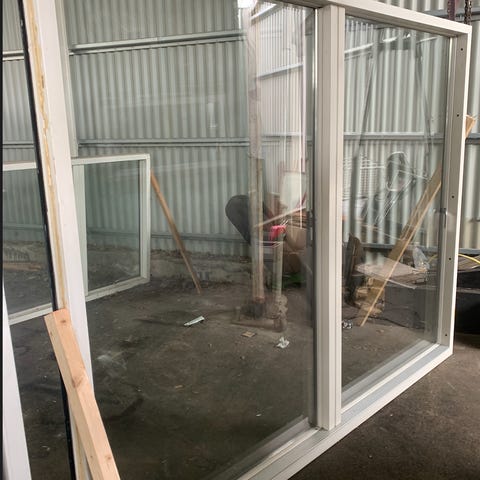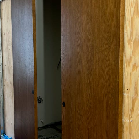 På grund av ändrade planer i renoverings projektet har jag oöppnat skjutdörrspaket av märke Swedoor till försäljning. Självaste dörren är i ek med tre små fönster med frostat glas.