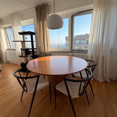 Matbord från Mio. Köpt för ca 6 år sedan. Laminat, mörkt/rökt trä. Använt skick. 200 cm långt, 200 cm brett, 75 cm högt. Se länk för mer info: https://www.mio.se/p/rockford-matbord-l-200-cm/280342?id=M1975738