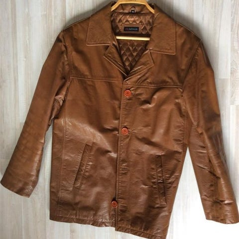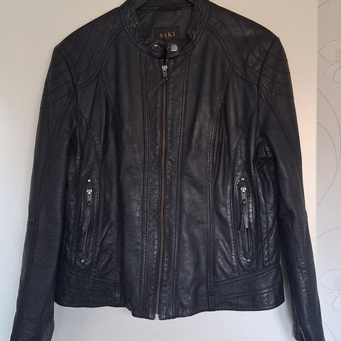 Jackan är i storlek 46 för dam (ganska liten i storlek). Den är tillverkad av läder och har en klassisk design med knäppning framtill och krage. Passar för användning som ytterplagg vid olika tillfällen.