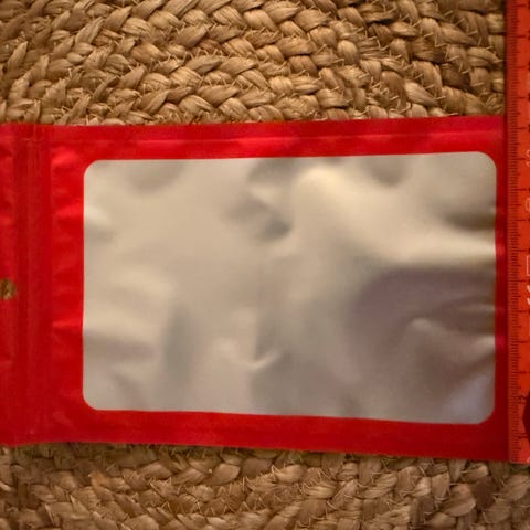 Röd förvaringspåse med återförslutningsbar öppning och hål för upphängning. Påsen är tillverkad i plastmaterial och har en storlek som kan uppskattas från bilder med måttband. Användbar för förvaring och organisering av små föremål.