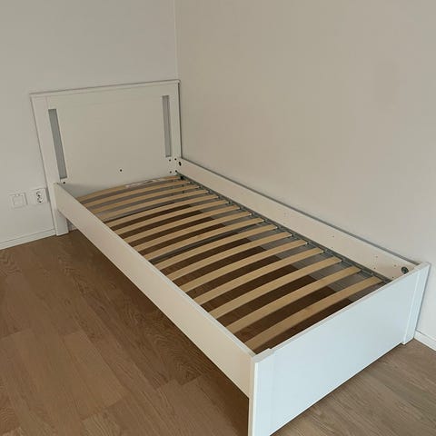 IKEA vit enkelsäng med ribbotten. Sängen har en vit ram och en ribbotten som ger stöd för madrassen. Enkelsängen är lämplig för en person och passar i mindre rum eller som extra säng.