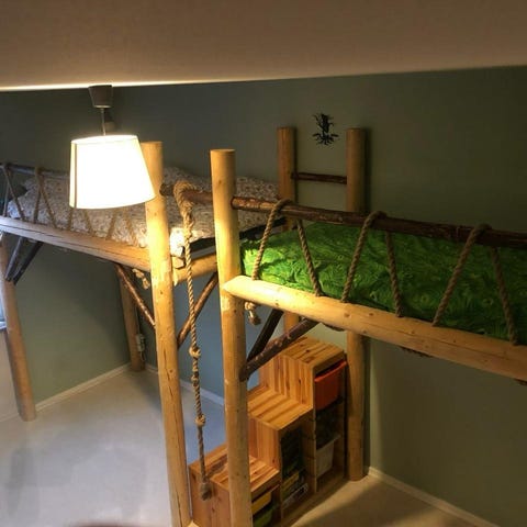 Loftsäng i massivt trä (fur eller gran), tillverkad i Estland.