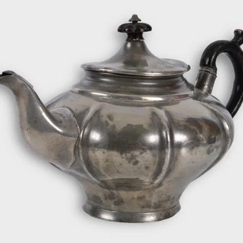 Metallkanna med dekorativt mönster runt midjan. Kannan har en handtag och en smal öppning upptill. Färgen är metallisk med inslag av mörkare detaljer i mönstret. Passar för användning som dekoration eller för att hälla vätskor.