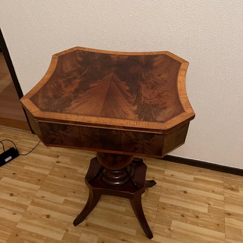 Mörkt träbord med snidade detaljer