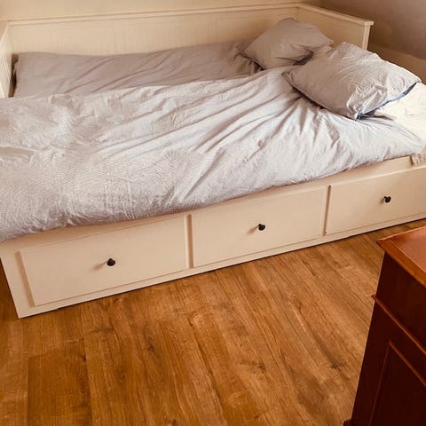 I gott skick, se bild för något synlig fläck uppepå gaveln samt bild på insidan av en av förvaringslådorna som är svag undertill men som går att använda för lätta saker. Från djur- och röfritt hem.