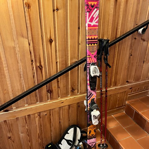 K2 Luvbug skidor i rosa färg med tillhörande stavar. Skidorna är designade för barn och passar för nybörjare och unga åkare. Stavarna är anpassade för barnstorlek och har handremmar för bättre grepp.
