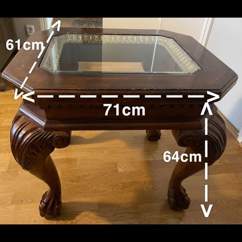 Gammal soffbord i massivt trä. Slitningskador på vissa ytor och sprickningar. Reparerad en gång i tiden, men håller bra. Mycket tung, så du måste ha mycket hjälp för att bära ut den.