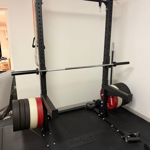 Säljer mitt Rogue HR-2 Monster Lite Half Rack med tillbehör pga platsbrist. Sjukt stabilt rack som tål allt du slänger på det och lite till! Tre vikthållare på varje sida som var och en kan bära 80 kg viktskivor. Pullupstång för häng-övningar samt att fästa ringar i. Ett par J-hooks ingår. Inkluderar också säkerhetsarmar för att köra tunga övningar säkert. Extra balk mellan bakstolparna för ytterligare stabilitet.