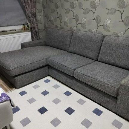 Bekväm hörnsoffa i grått tyg. Kläddselen är tvättbar och tvättades senast för en månad sedan.