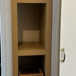 IKEA bokhylla gammal model men är i gott skick. Möbeln är avsedd för förvaring av böcker och andra föremål och är placerad i ett vardagsrum. Den har en mörk färg och flera fack för organiserad förvaring.