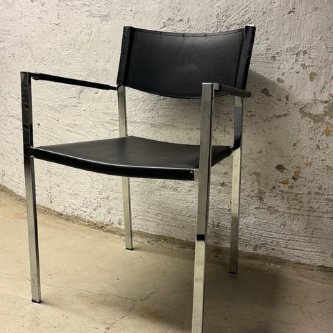 Säljer fyra eleganta stolar med tydlig Bauhaus-känsla. Kromad stålrörsstomme kombinerad med nyklädd sits och rygg i ljust, slitstarkt tyg. Enkel och genomarbetad form som påminner om klassiska projekt- och konferensstolar från t.ex. Kinnarps.