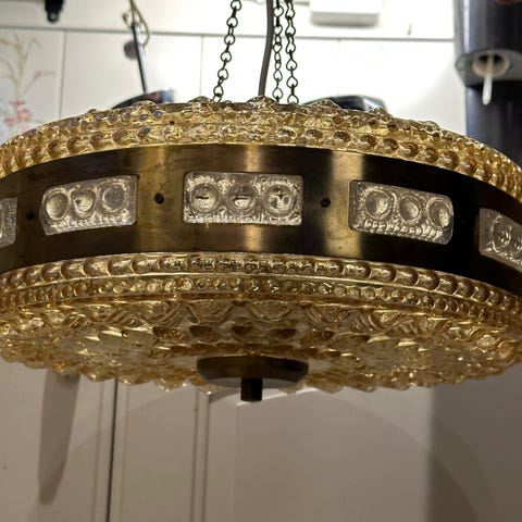 CARL FAGERLUND, taklampa, Orrefors, 1900-tal, pressglas samt mässing, höjd ca 55, diameter ca 38 cm