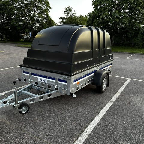 Täckt släp uthyres. 1300kg totalvikt. Lastvikt 1005kg. Tippfunktion.