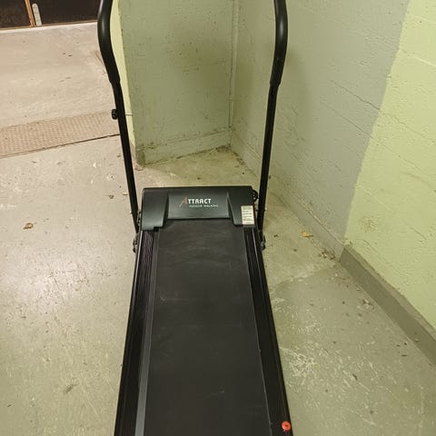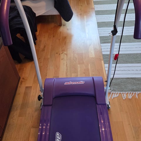 Gåband från Amazon. Ca ett år gammalt. Styrs av fjärrkontroll. Har hjul så lätt att rulla in under soffa eller säng om man inte vill ha det framme. Inga problem eller fel med det men ska flytta så försöker bli av med så mycket som möjligt