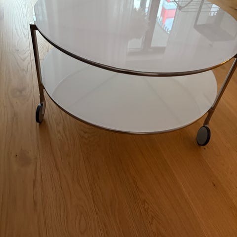 Soffbord Strind från IKEA designat av Ehlen Johansson. Ett runt soffbord med hjul i vitt opalglas och borstat stål. Diameter: 75cm, höjd: 41 cm.