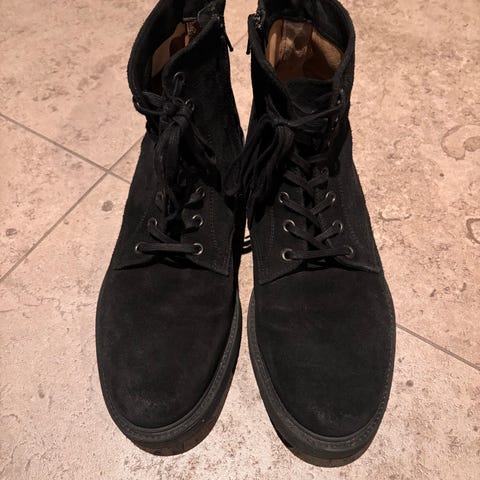 Säljer ett par svarta fodrad kängor. De har snörning framtill och dragkedja på sidan för enkel användning. Innersulan har ett kamouflagemönster med texten 'RAW'. Storleksinformation finns på insidan av skon.