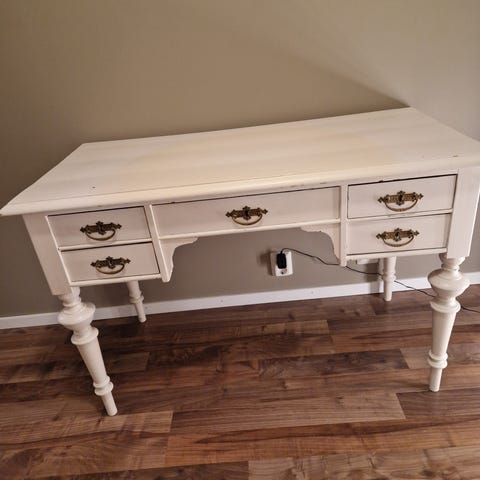 Vit skrivbord med guldfärgade knoppar. 5 st lådor och ett skåp.