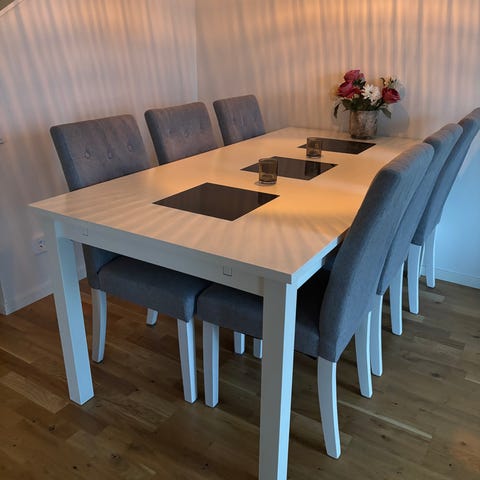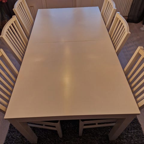 Säljer ett matbord som man kan göra det mindre eller större när man ha gäster, med 6 stolar.