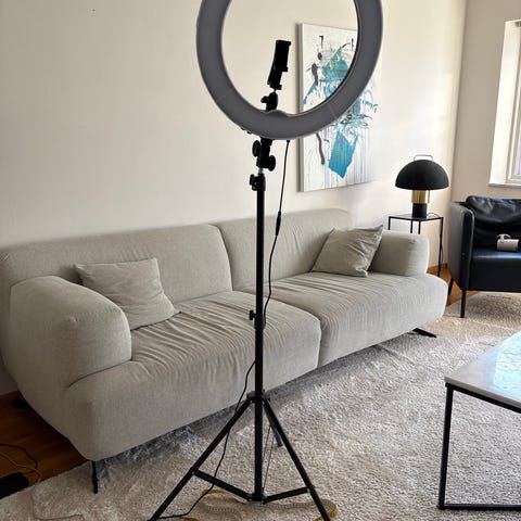 Ringlight med telefonhållare, 3 olika ljusinställningar som alla går att dimma. En knapp är borta men funkar fortfarande att trycka på, bara symbolen saknas. Går att göra längre, kortare, fälla ihop benen samt böja.