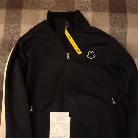 Moncler herrtröja i storlek M, svart färg och tillverkad av bomull. Tröjan har huva och dragkedja framtill samt två framfickor med dragkedja. Den är försedd med Moncler-logotyp på bröstet.