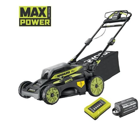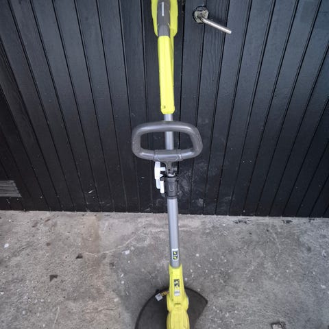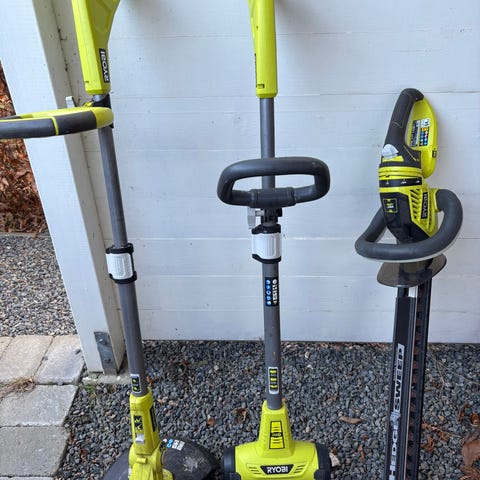 Ett set med Ryobi ONE+ trädgårdsverktyg. Inkluderar en häcksax (modell RY18HT55A), en grässax/busktrimmer (modell OGS1822), en kanttrimmer (modell OLT1832) och en patio cleaner (modell OPC1800). Batteri ingår och laddare