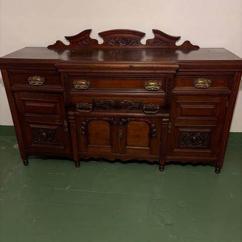 Skrivbord i trä med en låda och en glasplatta på ovansidan. Bordet har smala ben och en mörk träfinish. Passar för användning som sideboard/sängbord/avlastningsbord