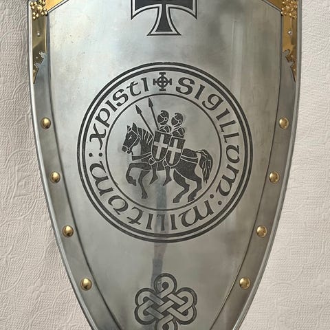 SÀljer ett fullstort riddarsvÀrd i massivt stÄl. Tung och gedigen konstruktion, flera kilo. Rikt dekorerat fÀste och graverat blad i klassisk medeltida stil. Mycket fint skick med lÀtt patina. Perfekt för samlare, vÀggdekoration eller rekvisita.
