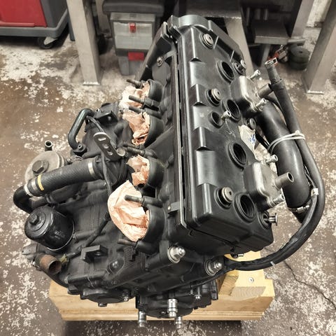 Samling av olika motorcykeldelar inklusive bromsskivor, kablar, instrumentpanel, bromsbehållare och diverse fästen och beslag.