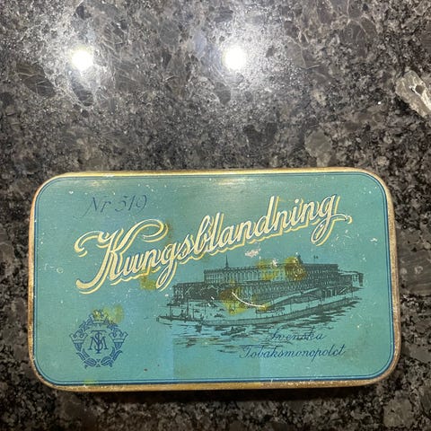 Skaugum Mixture plåtask i metall i ok skick. Från Drammen i Norge.