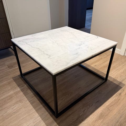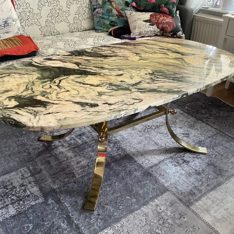 Gediget soffbord med marmorskiva. Går att höja och sänka lite. -70/-80-tal.