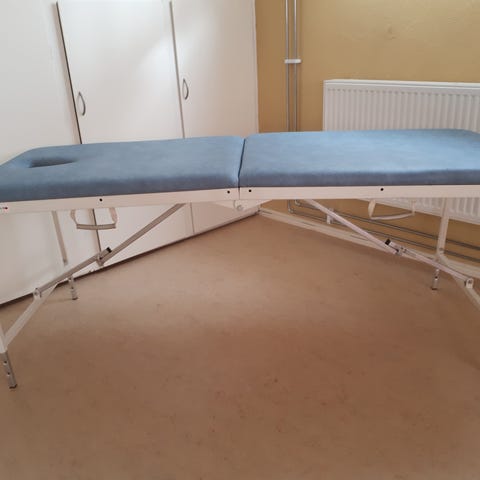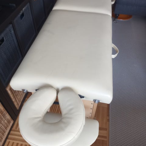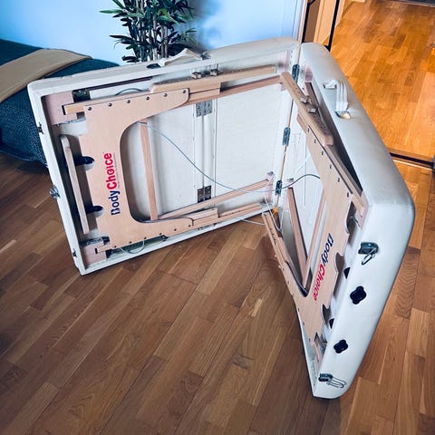 Massagebord, knappt använd, kan vikas upp och visa tillbehör på insidan vid hämtning.