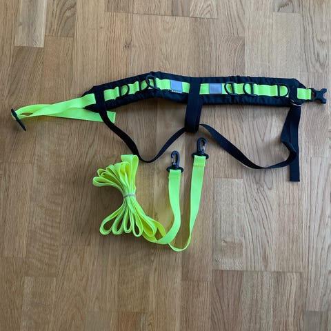 Fästes runt midjan och benen på barnet för ett säkert grepp med jämnt fördelat tryck. Linan kan fästas vid olika punkter på selen för varierande rörelsefrihet/svårighetsgrad.