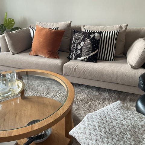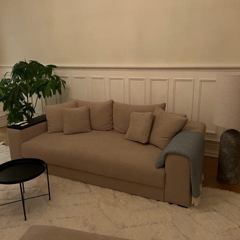 Soffa och fåtölj i beige sammetstyg. Soffan har en rak design med tre sittplatser och fåtöljen har hög rygg. Passar för vardagsrum eller loungemiljöer. Soffan kan man också använda som bäddsoffa.