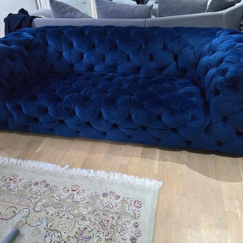 Exklusiv Benito Soffa i mörkblått sammets tyg (Ritz) med knappar i ryggstödet. Soffan har en mycket klassisk design liknande Chesterfield med djup sittdyna och 2 två lösa Kuddar, samt 2 Rullkuddar.