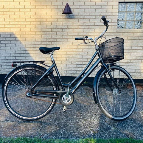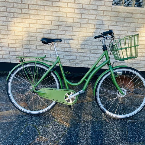 Röd damcykel utrustad med framkorg och pakethållare. Cykeln har en klassisk design och är lämpad för vardaglig användning och transport. Kvitto finns