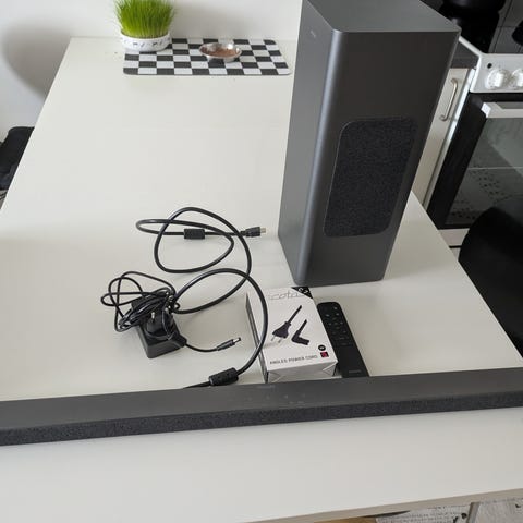 Samsung Dolby Atmos-ljudsystem bestående av en soundbar, en subwoofer och två bakhögtalare. Systemet är avsett för att förbättra ljudupplevelsen vid TV- och musiklyssning och var rankat som det bästa soundbar-systemet när det kom för några år sedan.