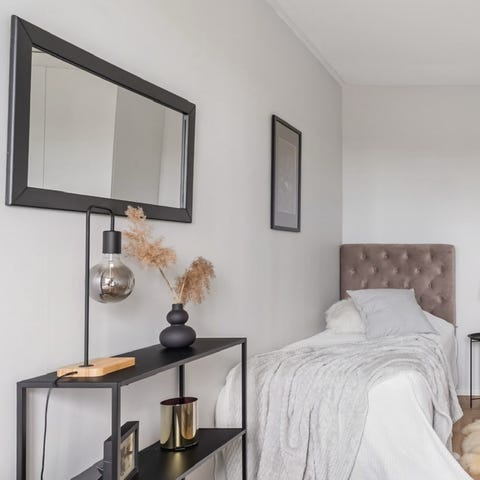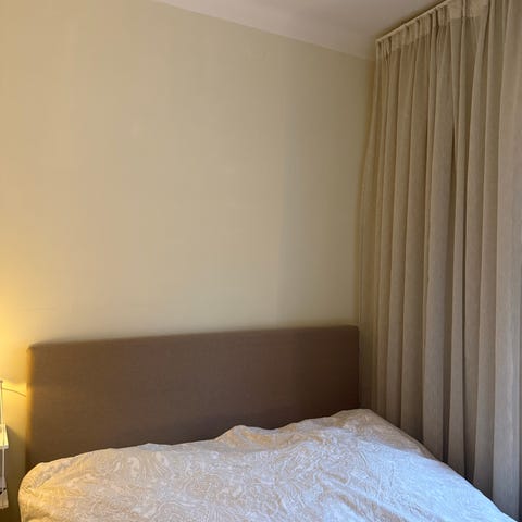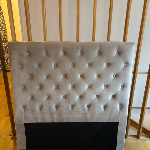 Jysk sänggavel i grå sammet med knappar och stoppning. Passar som huvudgavel till säng och ger en mjuk och bekväm yta att luta sig mot.