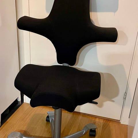 HÅG Capisco 8107 är en ergonomisk kontorsstol med nackstöd och sadelsits för dig som vill sitta aktivt. Stolen ger automatiskt bättre hållning och minskar risken för värk. Nypris runt 20 000 kr.
