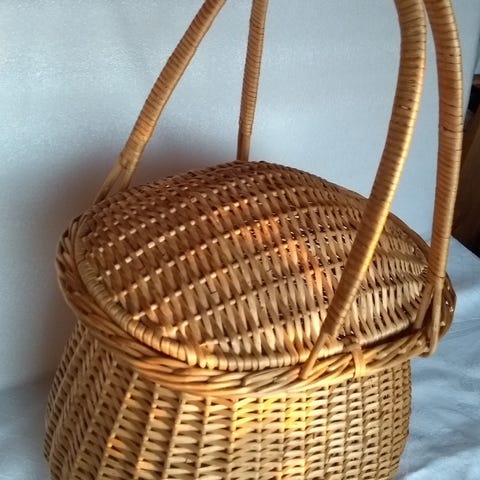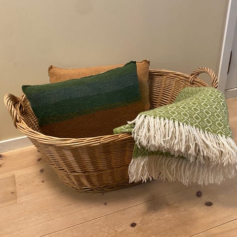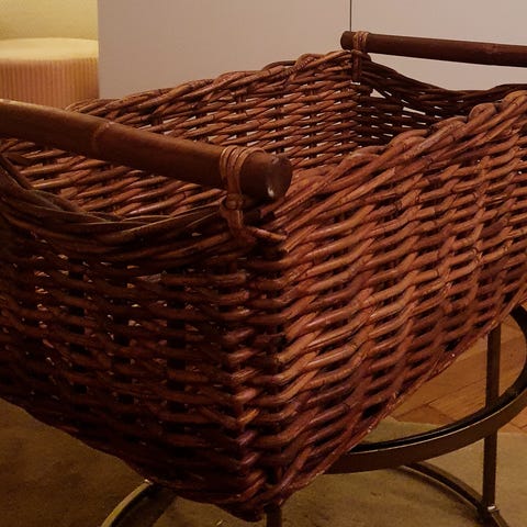 Korg i rotting. 75 cm bred, 45 cm djup och 26 cm hög. Filtar ingår ej.