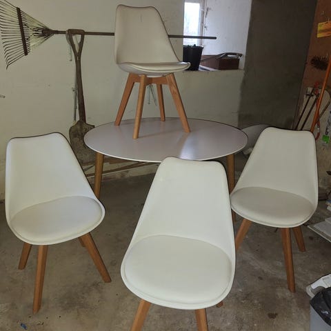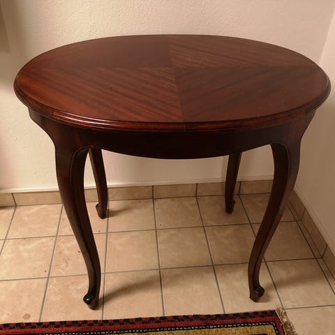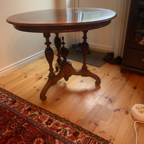 Inköpt 1962 från Rörs möbeltillverkning i Tvååker. Bordsytan något skadad.