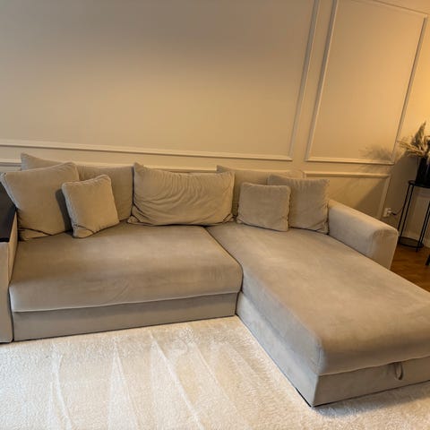 Sweef hörnsoffa i grå klädsel. Soffan har generös sitt- och liggyta med divanliknande del och flera lösa rygg- och prydnadskuddar.Färgtonen är neutral grå som fungerar tillsammans med många inredningsstilar.